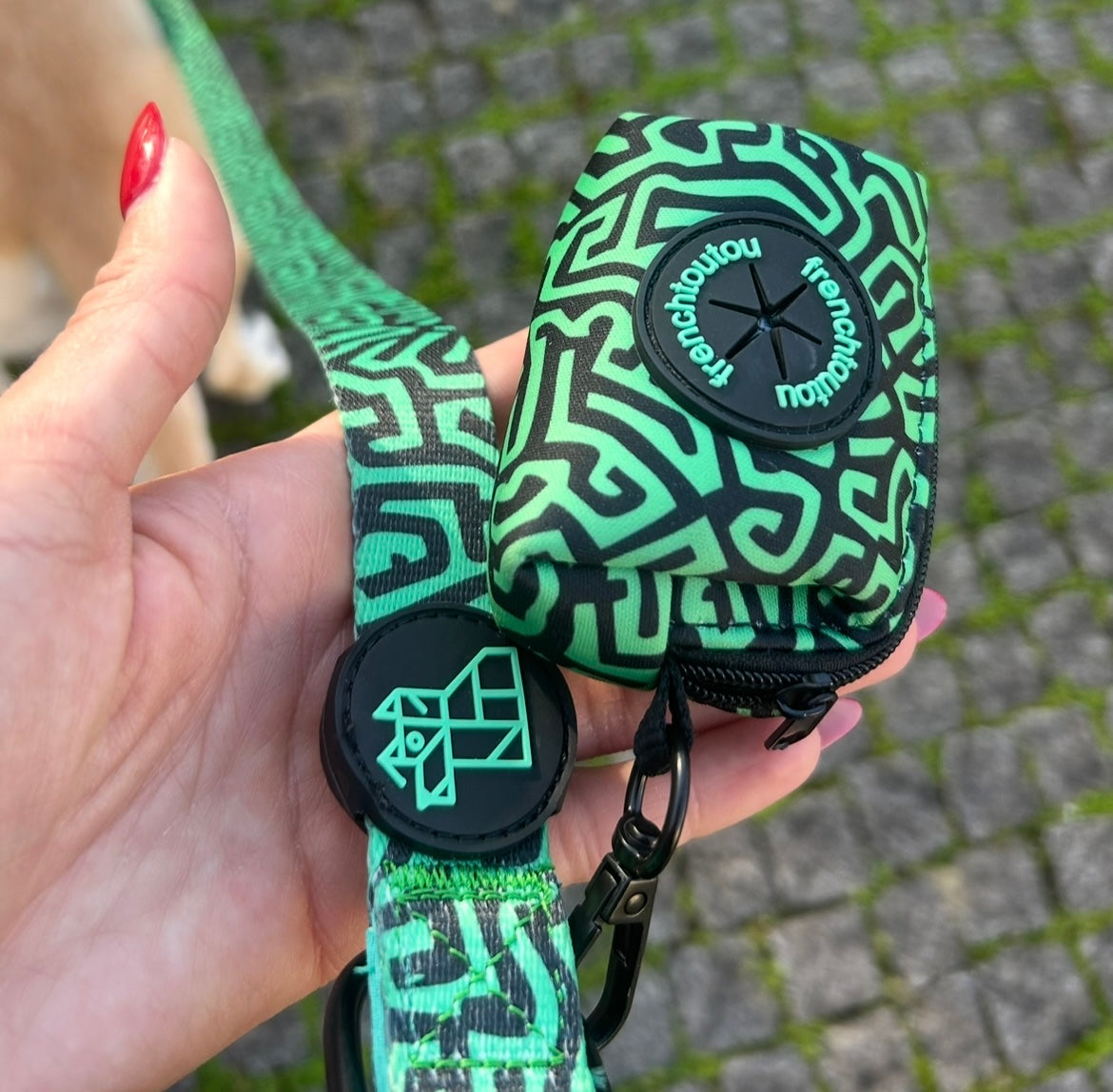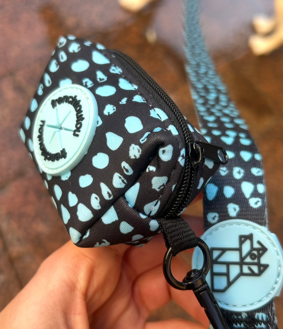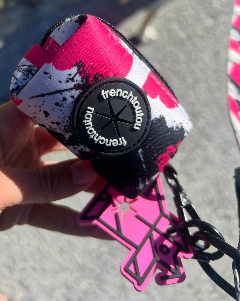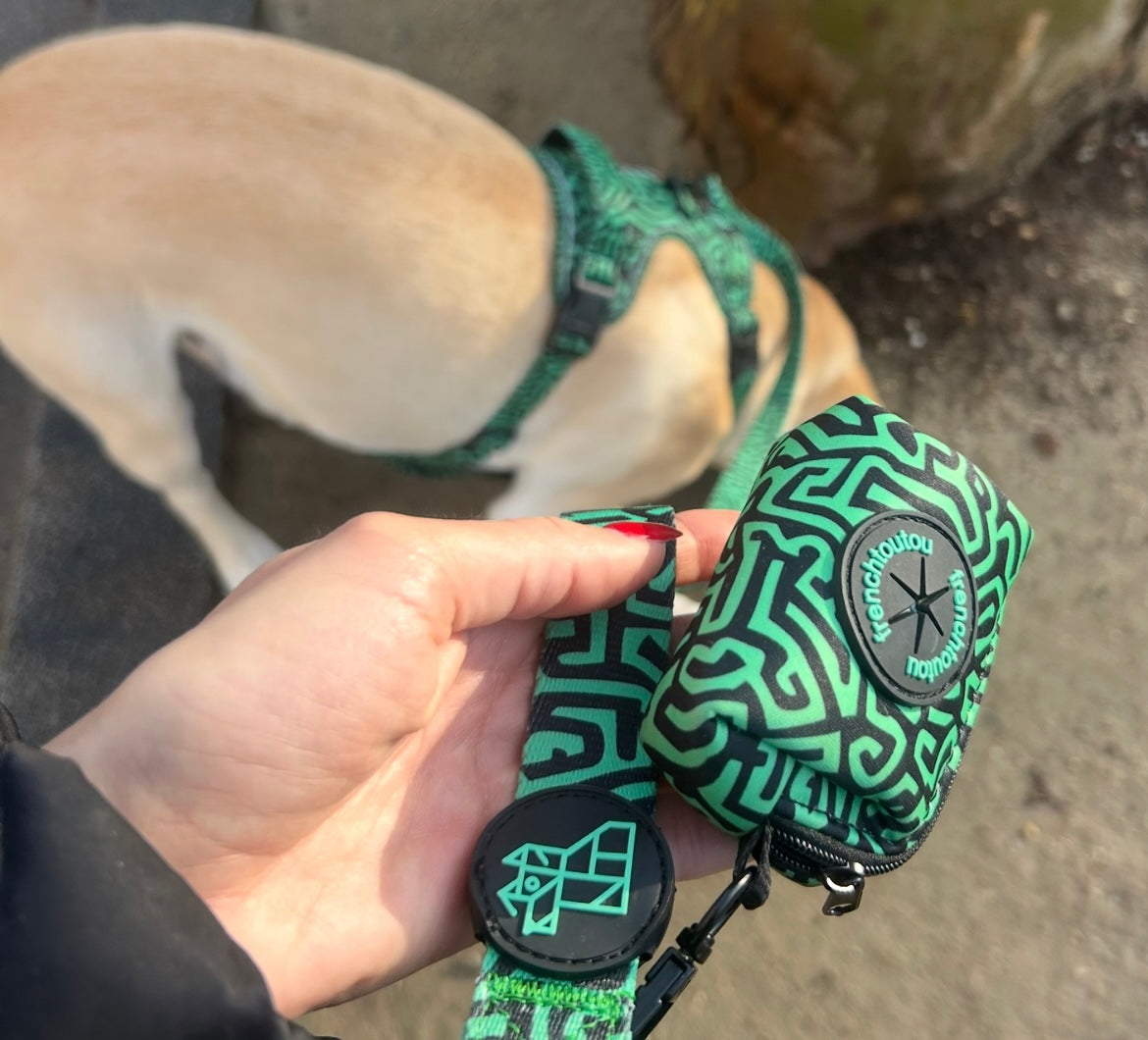 Su diseño gráfico y colorido, característico de Frenchtoutou, convierte un accesorio cotidiano en un objeto de moda, que combina perfectamente con las correas y arneses de la colección.