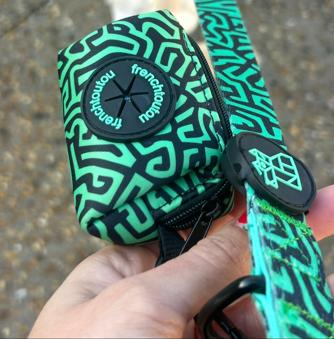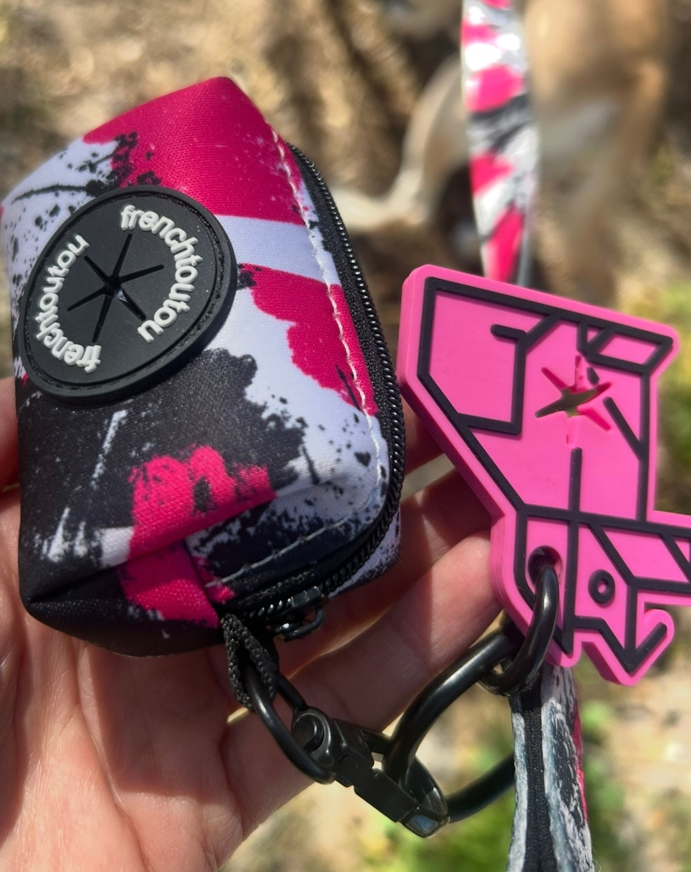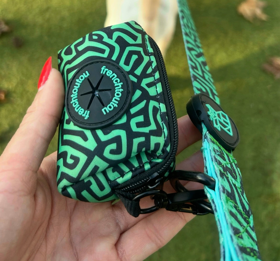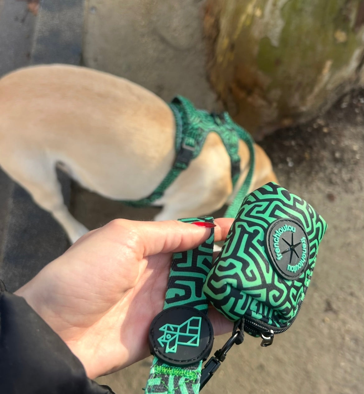 Su diseño gráfico y colorido, característico de Frenchtoutou, convierte un accesorio cotidiano en un objeto de moda, que combina perfectamente con las correas y arneses de la colección.
