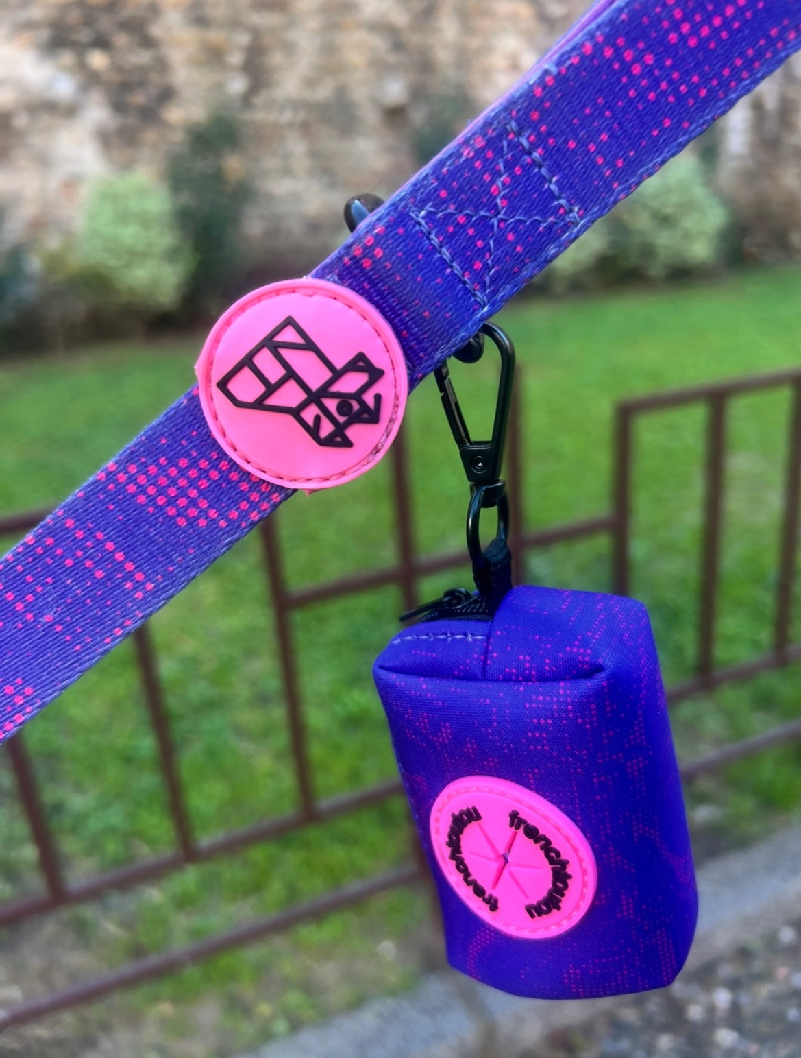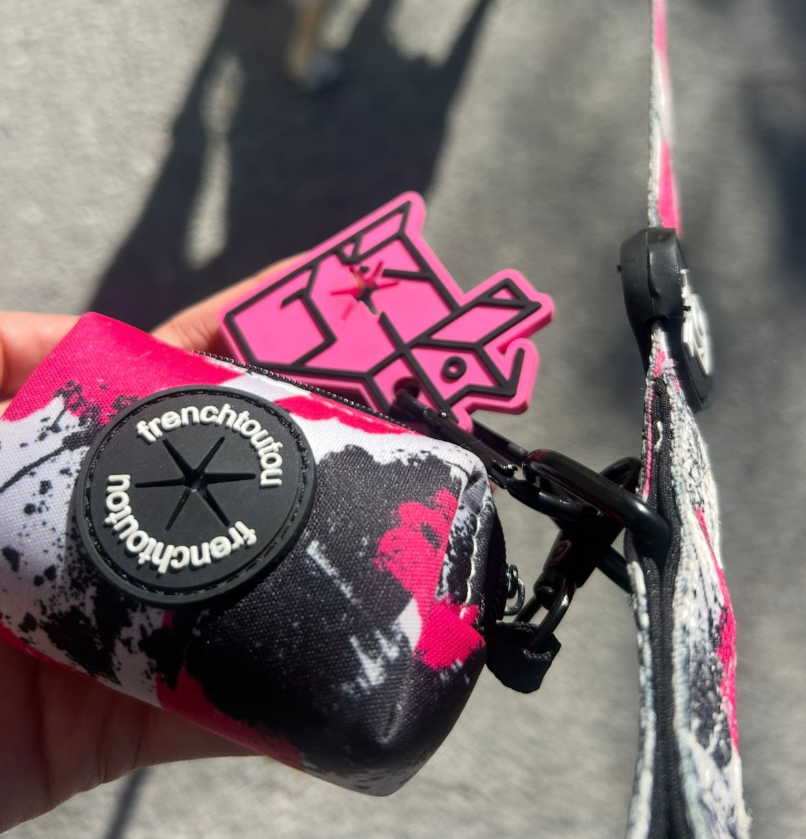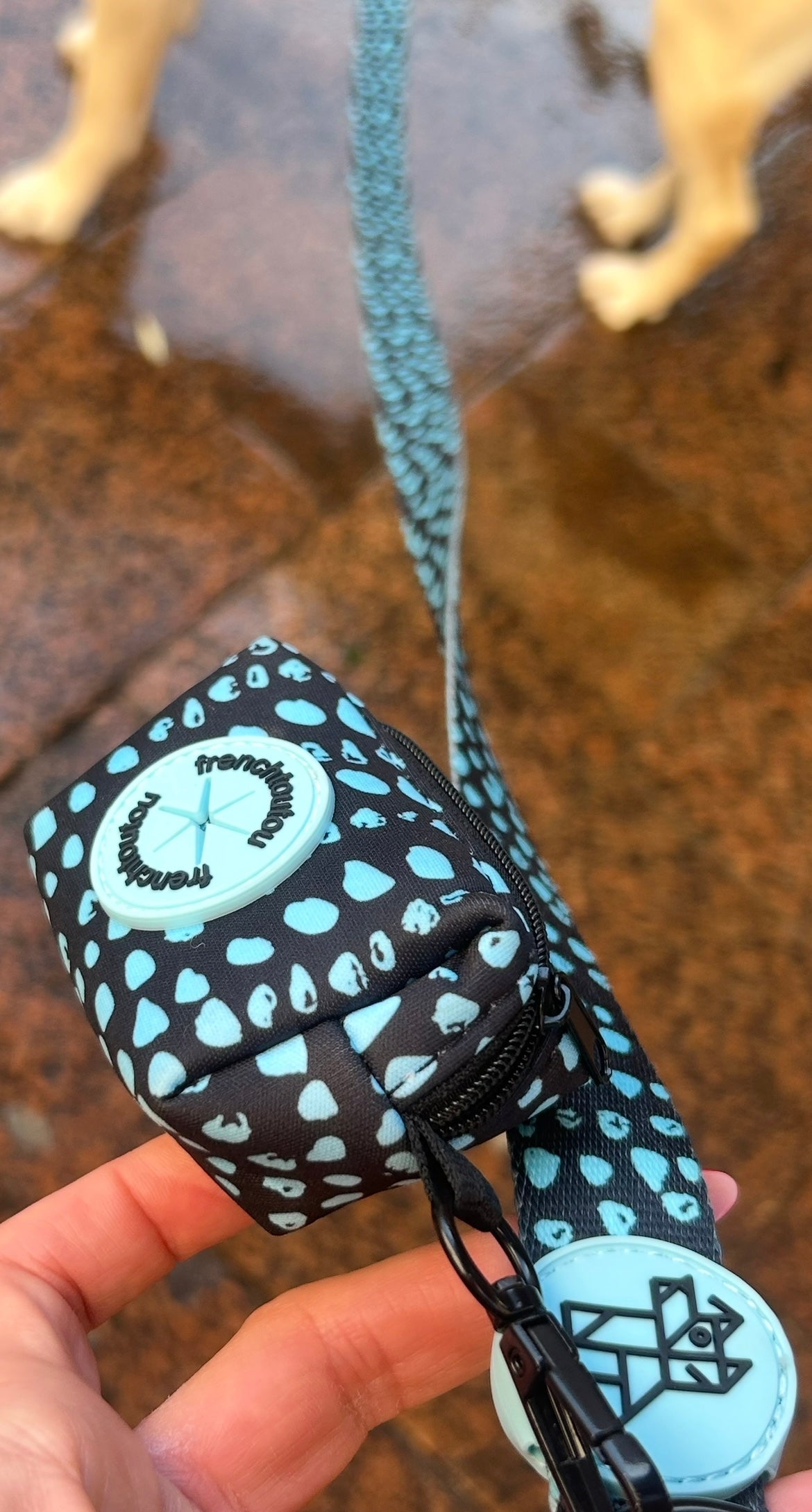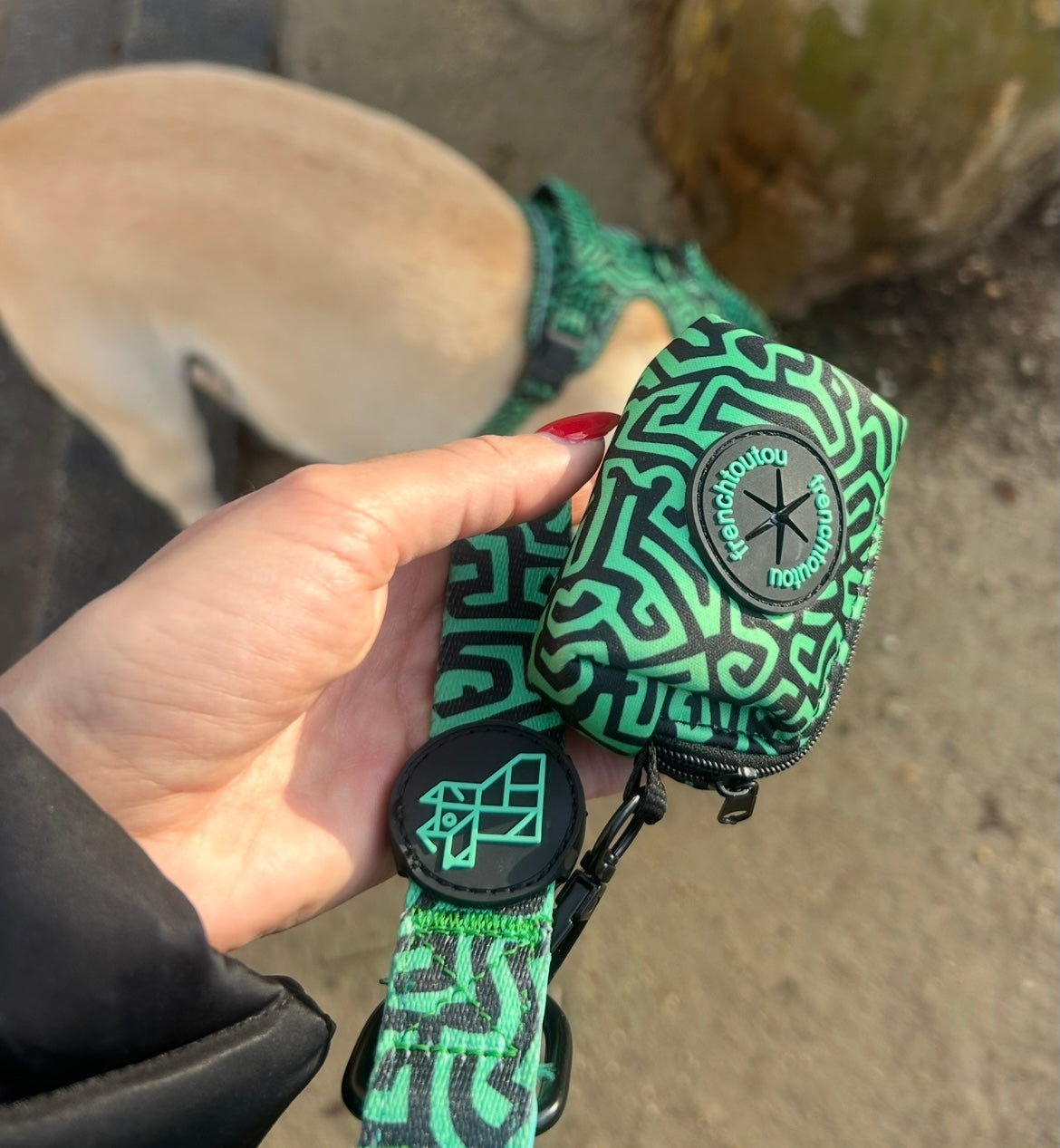 Su diseño gráfico y colorido, característico de Frenchtoutou, convierte un accesorio cotidiano en un objeto de moda, que combina perfectamente con las correas y arneses de la colección.